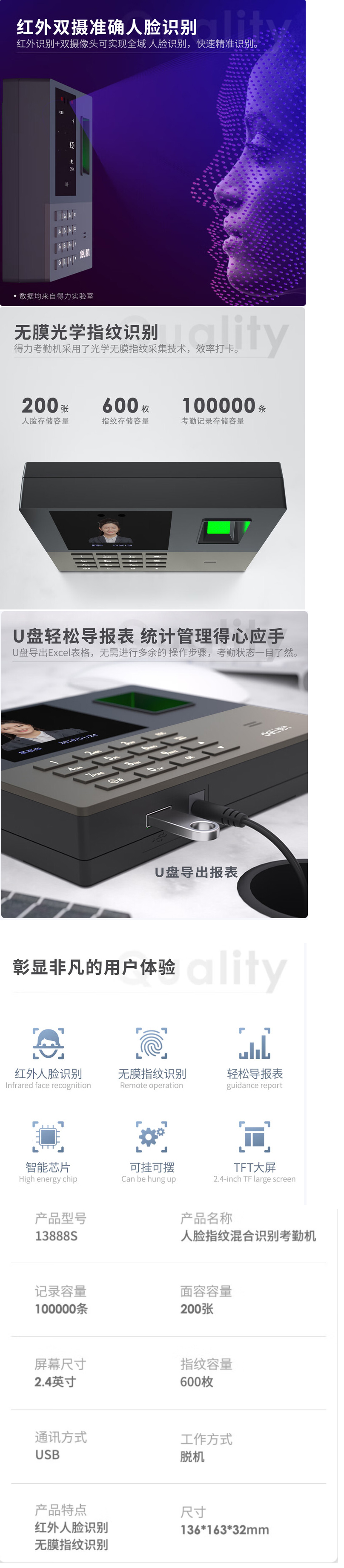 >得力(deli)门禁系统 13888S 刷脸考勤机 打卡器U盘导出 -银灰色